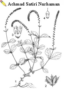 An annual to perennial herb, 30—50 cm tall, erect or ascending, rooting at the nodes, stem obtusely quadrangular, thickened above the nodes, often tinged with red, covered with patent, fine hairs. Leaves opposite, simple, rhomboid-obovate to rhomboid-oblong, 1.3—15 cm x 0.7—6.5 cm, base contracted or narrowed, rounded, apex triangular, acute to obtuse, entire, ciliate, margin or blade often tinged red; petiole short. Inflorescence an erect, elongated raceme, terminal and in highest leaf-axils, straight or sinuous, 18—33 cm long, rachis densely pubescent; peduncle 1—12 cm long; flowers in small clusters, in the lower part of the raceme distant, in the higher part crowded, pedicel short, erect before anthesis, reflexed in fruiting, bracts ovate, acuminate; lower clusters with 2—3 bisexual flowers and several sterile ones, with up to 20 red, hooked awns, towards the apex fewer sterile flowers, at apex only solitary bisexual flowers, ripe clusters falling off as a whole. Flowers small; tepals 5, free, in bisexual flowers ovate-oblong, 2.5—3 mm long, strongly mucronate, dull pale green, glabrous within, externally clothed with patent long, white hairs, tepals of sterile flowers 1.7—2.5 mm long, sessile; stamens 5, filaments connate at base, free parts 1 mm long, anthers 2-celled, pseudo-staminodes rectangular-cuneate, apex truncate; ovary superior, obovoid, 1-celled, funicle short, style filiform, stigma capitellate. Fruit an ellipsoid utricle, 1.5—2 mm long, thin-walled, glabrous, 1-seeded, surrounded by stiff perianth. Seed ovoid or ellipsoidal, 1—1.5 mm long, shiny brown. Seedling with epigeal germination.