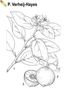 | Citrus aurantifolia (Christm. & Panzer) Swingle - 1, flowering branch; 2, branch with fruit; 3, fruit in cross-section |