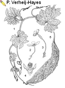 | Momordica charantia L. — 1, leafy shoot; 2, male flower in longitudinal section; 3, female flower in longitudinal section; 4, male flower in cross section with petals removed; 5, fruit |