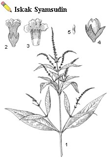 | Buddleja asiatica Lour. - 1, flowering branch; 2, flower; 3, opened corolla showing stamens; 4, fruit; 5, seed |