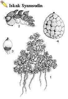| Azolla pinnata R. Br. - 1, habit; 2, branch with basal sporocarp; 3, megasporocarp [female]; 4, microsporocarp [male] |