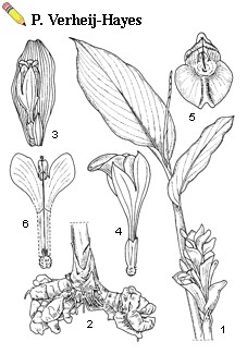 | Curcuma zedoaria (Christmann) Roscoe - 1, leafy and flowering stem; 2, tuberous rhizome; 3, bract with cincinnus; 4, flower in lateral view; 5, flower in front view; 6, stamen and lateral staminoides |
