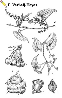| Dioscorea alata L. - 1, female flowering shoot; 2, male flowering shoot; 3, tuber types; 4, female flower; 5, male flower |