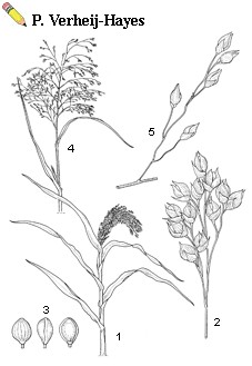 | Panicum miliaceum L. cv. group Proso Millet cv. subgroup Contractum: - 1, habit flowering stem; 2, detail inflorescence branch; 3, grains; cv. subgroup Miliaceum: - 4, habit flowering stem; 5, detail inflorescence branch |