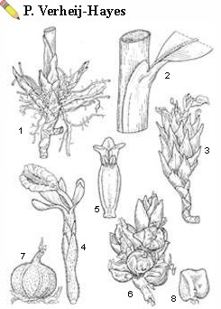 | Amomum compactum Soland. ex Maton — 1, stem part with rhizome; 2, stem part with leaf base; 3, inflorescence; 4, flower; 5, stamen; 6, infructescence; 7, fruit; 8, seed |