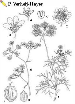 | Coriandrum sativum L. — 1, flowering branch; 2, umbellet; 3, peripheral flower with enlarged petals; 4, central flower; 5, normal [non-enlarged] petal; 6, fruiting branch; 7, fruit; 8, seed |