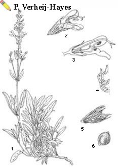 | Salvia officinalis L. — 1, flowering branch; 2, flower; 3, section through flower; 4, stamens; 5, calyx; 6, nutlet |