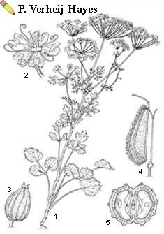| Pimpinella anisum L. — 1, habit flowering plant; 2, flower; 3, fruit; 4, mericarp; 5, cross-section through fruit |
