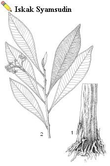 | Tristaniopsis whiteana (Griffith) Peter G. Wilson & J.T. Waterh. – 1, trunk base; 2, flowering twig. |