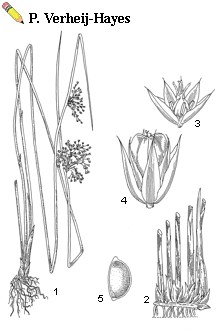 | Juncus effusus L. - 1, habit flowering plants; 2, basal part of stems with rhizome; 3, flower with one tepal removed; 4, fruit in perianth; 5, seed |