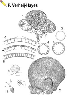 | Dictyosphaeria cavernosa (Forssk.) Børgesen – 1, habit of a young specimen; 2, habit of a mature specimen; 3, cross-section of an undivided unicellular primary vesicle [diagrammatic]; 4,5, formation of secondary vesicles inside the primary vesicle [cross-sections, diagrammatic]; 6, the original wall of the primary vesicle has burst; 7, spherical protoplasmatic bodies are formed; 8, tertiairy vesicles have been formed [6,7,8 diagrammatic cross-sections to show formation of tertiairy vesicles]; 9, habit of unicellular germling; 10, gamete with 2 flagella and an eyespot; 11, zoospore with 4 flagella and an eyespot |