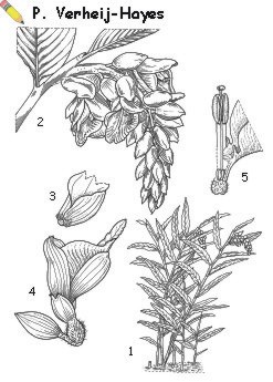 | Alpinia zerumbet (Pers.) Burtt & Smith — 1, habit; 2, inflorescence; 3, bracteole; 4, cincinnus with 2 flowers [one bracteole removed]; 5, corolla tube dissected showing stamen, staminoides, epigynous glands and stigma. |