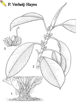 | Ficus elastica Roxb. - 1, stembase of old tree; 2, branch with leaves and twigs; 3, central female flower with 2 lateral male flowers |